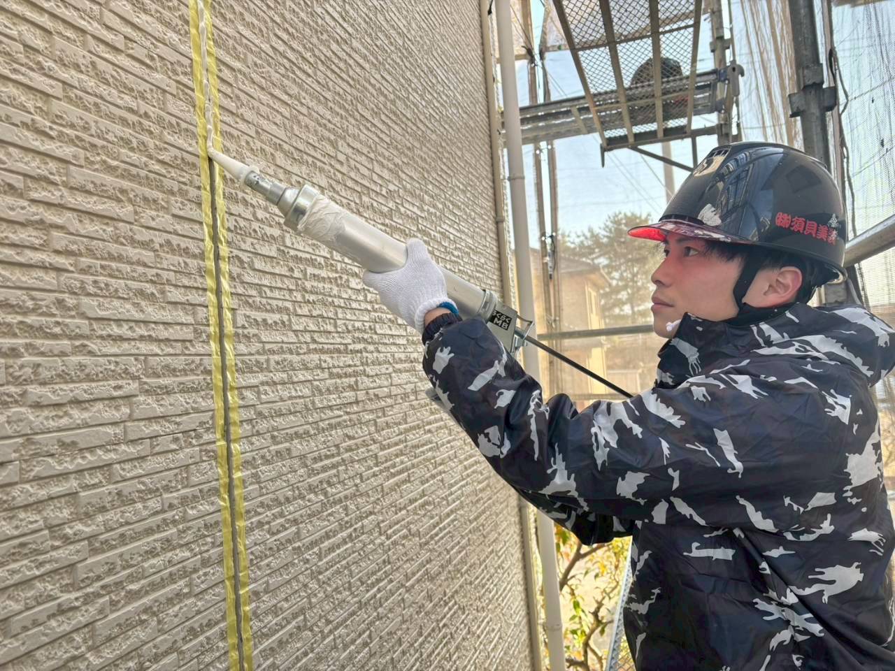 防水やシーリング工事は、完成後に見えにくい部分だからこそ、確かな技術が求められます。ひび割れや劣化を見逃さず、建物の状態に合わせた施工を行っています。写真からも分かるように、集中した表情で一つひとつの作業に向き合う姿勢が須貝美装の強み。安心して任せていただける理由がここにあります。