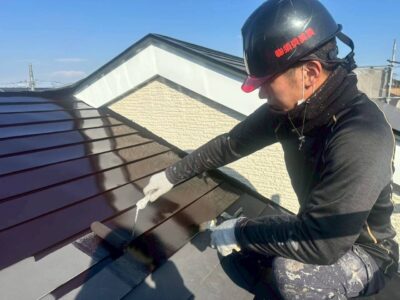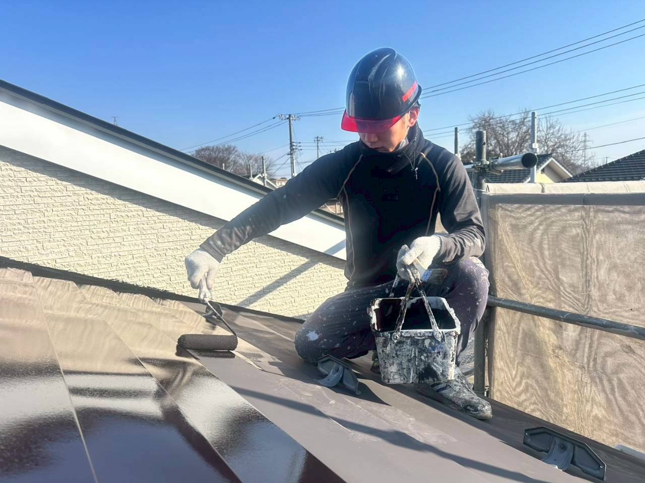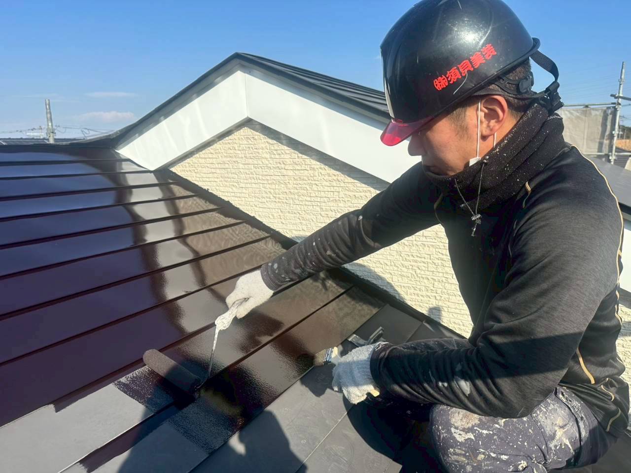 外壁や屋根の塗装は、見た目だけでなく建物の耐久性を左右する重要な工程です。下地処理から仕上げまで手を抜かず、細かな部分まで丁寧に作業を進めています。現場では経験や役割に関係なく声を掛け合い、仕上がりを確認しながら進行。須貝美装らしい、真剣さとチームワークが表れる瞬間です。